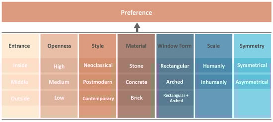 Although existing research has examined the relationship between building facades and visual preferences [12], relatively few studies have focused specifically on the architectural characteristics of shopping centers and their influence on visitor behavior. This study seeks to address that gap by exploring how specific facade features affect individuals’ preferences and intentions to visit. To advance this understanding, it is first necessary to identify and describe key architectural attributes that define building facades. The following section identifies seven such attributes, drawing upon prior studies that have investigated their impact on visual preferences and user experiences.