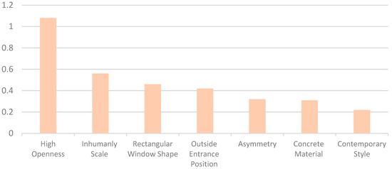 The results indicated that the attribute of openness had the greatest influence on participants’ choices. Consequently, it can be concluded that facades with high levels of openness represent the most significant factor shaping public preference. While moderately open facades also had a positive effect, their impact was less pronounced. This finding aligns with prior research emphasizing the role of transparency and visual accessibility in allowing passersby to observe and engage with interior activities [14]. In contrast, facades with low openness had minimal influence on preferences, supporting the view that a building’s function should guide design decisions [18]. For example, residential buildings typically require more privacy, whereas shopping centers benefit from transparent facades and window displays that reveal interior content and stimulate interest [46].