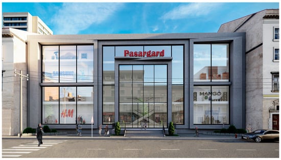 The first element individuals typically encounter when approaching a building is the surrounding street and the building’s entrance, which serves as a transitional space linking the exterior and interior environments. Yammiyavar and Roy [12] identify the entrance as a key component of the facade that significantly influences visitors’ perceptions of shopping center design, playing a vital role in encouraging entry. To highlight this intermediary zone, architectural features such as stairs, platforms, and projections are often employed. Furthermore, the importance of designing shopping center entrances in accordance with comprehensive international standards has been emphasized in the literature [13]. One particularly influential aspect of the entrance is its position relative to the building, especially when viewed from a pedestrian’s eye level [12].