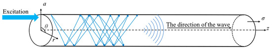According to the acoustoelastic theory, the propagation characteristics of ultrasonic waves in a medium are affected by stress. This effect is mainly reflected in the fact that the propagation speed of ultrasonic waves varies with different stresses. The material properties are replaced with the corresponding relationship of the second-order elastic constants of the material to achieve the acoustoelastic simulation of ultrasonic guided waves in the waveguide structure. For an infinite medium, the acoustoelastic theory involves body waves in three mutually orthogonal directions, and the relationship between stress and wave speed is the relationship between components in multiple directions [26]. As shown in Figure 1, for a uniform and isotropic slender rod under uniaxial stress, the propagation of ultrasonic waves is in the longitudinal guided wave mode along the direction of tensile stress. Therefore, the acoustoelastic theory can be simplified to the relationship between stress and body waves under a uniaxial stress state:
