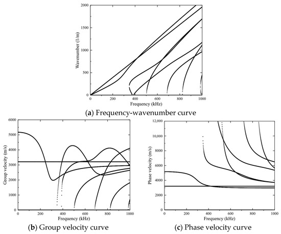 The core of researching ultrasonic guided waves is to solve the frequency equation. Intuitively, the frequency equation is represented by the dispersion curve. Mathematically, multimodality means that the frequency equation has multiple solutions. By numerically solving the transcendental equation for ω and k, the relationship between the angular frequency and the wave number of the circular rod under a stress-free state can be obtained. Then, according to the phase velocity calculation formula and by transforming the abscissa into the frequency f, the phase velocity frequency dispersion curve can be obtained. Similarly, according to the group velocity calculation formula and by further substituting the result variables, the group velocity frequency dispersion curve can be obtained. The dispersion curves of the circular rod under a stress-free state can all be solved by numerical methods. The longitudinal mode dispersion curve of a steel wire with a diameter of 5.22 mm, solved by the GUIGUW 2.2 guided wave dispersion curve software, is shown in Figure 2. This diameter is selected to match the actual wire size of 5.22 mm in the seven-wire strand, which ensures that the theoretical model can accurately reflect the physical properties of the strand and improve the accuracy of wave propagation prediction. In addition, the use of a diameter of 5.22 mm also enhances the correlation with the experimental setup, which helps directly correlate the theoretical prediction with the measured notch frequency under different axial loads.