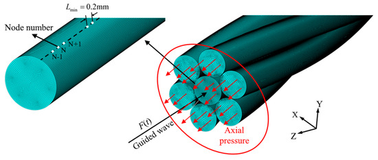 Since the sensitivity characteristics of guided waves to stress in a steel strand under axial tension simulated by the FEM are affected by the limitations of the excitation time sequence and to make it a quasi-static loading process, it is considered to conduct a static analysis (Standard) first, and then import the results of the static analysis into the dynamic analysis (Explicit) in the form of a predefined field. This method can avoid the influence on the effectiveness of guided wave propagation caused by the instantaneously applied tension. The guided wave propagation process is carried out after the steel strand becomes stable under the action of the axial force. The fully automatic integration time step is used in the static analysis step. When simulating the wave propagation process dynamically, it is recommended that the time integration step should be small enough to ensure good temporal resolution, and the propagation of the longitudinal wave at the minimum spatial resolution should be captured within a unit integration time. In addition, the time integration step should meet the Shannon criterion of FFT. In summary, the time integration step should satisfy: