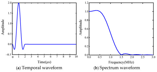 Since the steel strand is a spatial spiral structure, in practical engineering applications, extrusion and friction will occur when the two ends of the steel strand are subjected to tension, so it is necessary to simulate the contact relationship between the steel wires inside the steel strand. The finite slip surface-to-surface contact is used to simulate the extrusion and sliding friction between steel wires when the steel strand is subjected to axial tension, and the ‘penalty’ contact method is used to ensure that different steel wire units are not interconnected. The contact between the steel wires is set as the hard contact in the normal direction of the two contact surfaces, the tangential friction contact is set and simulated by the ‘penalty’ friction formula, and the friction coefficient between the steel wires is 0.6 [28]. In the actual steel strand tensioning process, because the peripheral steel wire at both ends of the steel strand is clamped by the anchor, the internal steel wire will be elongated at the same time. In this paper, simulation modeling simplifies this process as all steel wires at one end of the model are completely fixed, that is, there is no displacement and rotation, and all steel wires at the other end only release axial displacement. The first static analysis only simulates the process of steel strand under the action of axial tension, and the tension is applied when the axial displacement is lifted. The second dynamic analysis simulates the wave propagation process when the steel strand is subjected to a stable axial force. The Ricker wavelet with a broadband and a concentrated frequency is applied at the tension loading end, and the amplitude spectrum of the waveform is asymmetric. At the same time, its spectrum is a smooth single-valued curve, and the frequency will decay quickly within a certain range. Therefore, it is used for the excitation of structural modal signals. The time-frequency domain diagram of the excitation signal is shown in Figure 4. The peak frequency of the signal is close to 1.4 MHz, and the frequency band is mainly in the range of 0~2 MHz.