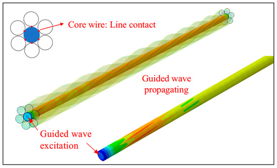 FEM of core wire and von Mises stress during guided wave propagation.