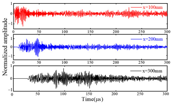 Spatial discretization requires multiple equidistant measurements at a sufficiently small distance to capture the minimum wavelength of interest. The acceleration time history signals of 1000 nodes in the FEM are extracted from the wave propagation path to form a time-space matrix , and the dispersion curve in the excitation frequency range can be obtained by 2D-FFT [29]. Figure 6 presents the normalized signal amplitude plots of transient acceleration signals at three different locations of the steel strand core wires. It can be observed from the figure that the presence of multimodal superposition prevents modal identification based on time domain signals.