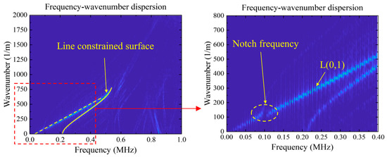 The regular movement of the dispersion curve indicates that the characteristics of the guided wave are influenced by the interfacial tension caused by contact effects. However, due to the limitations of the actual sensor installation position, it is difficult to apply this influence to the evaluation of prestress using 2D-FFT. Additionally, using directly detected physical quantities such as velocity and frequency, they vary relatively weakly with tension. Therefore, further signal processing techniques are needed to simplify operation and improve recognition capability. Further observation of the dispersion characteristics of guided waves in the L(0,1) mode shows that there is a gap-like region at a frequency of about 100 kHz. Kwun et al. [12] called this frequency band as notch frequency, which points out that there is an approximate exponential change between notch frequency and prestress, and a large number of related studies have proved the accuracy of the results. Therefore, the notch frequency can be considered a parameter to identify the prestress of steel strands.