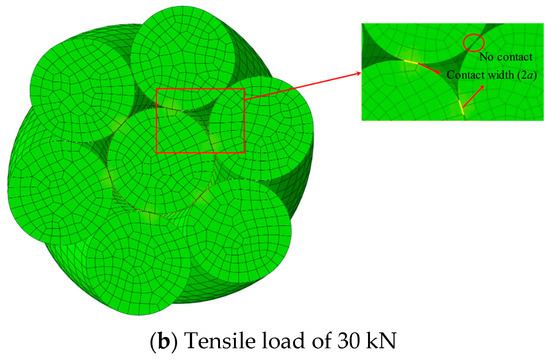 The axial force significantly affects the contact half-width α, which is due to the increase in the pressure between the wires in the tensile state. The FEM is initially a seven-wire steel strand configuration without stress, at which time the initial contact is minimal. Then, the static analysis step is carried out, and the tensile load is applied to simulate the axial force of 50 kN to 110 kN, with an increment of 30 kN as the predefined stress field. This process calculates the deformed geometry and the resulting contact half-width α according to the Hertzian contact theory, where α is proportional to the square root of the applied load and the wire stiffness (as approximated in Equation (12)). Subsequently, the updated contact half-width values (for example, for the 12.7 mm steel strand, from 0.15 mm at 50 kN to 0.22 mm at 110 kN) are incorporated into the dynamic explicit model for ultrasonic guided wave propagation to ensure the real simulation of inter-wire interaction without assuming constant contact.