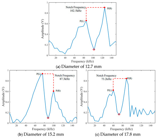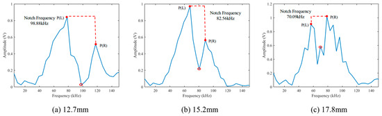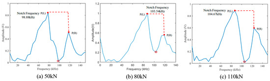 The measured frequency spectrum of three steel strands with diameters of 12.7 mm, 15.2 mm, and 17.8 mm under a constant axial load of 80 kN is presented in Figure 15. In each spectrum, a distinct notch in amplitude is observed within the 70~105 kHz range, corresponding to the destructive interference of the L(0,1) guided wave mode. This notch represents a localized suppression of wave energy and serves as a stress-sensitive feature.