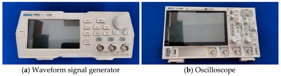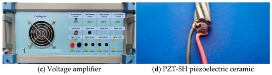 Both ends of the steel strand are polished as flat as possible, and then a piezoelectric ceramic (PZT) is bonded with an epoxy resin. The PZT is connected to the oscilloscope, and then each wire is tapped gently to ensure that the vibration signal of each wire can be converted into a displayable electrical signal through the PZT. The transmitting transducer was driven by a high-frequency function generator amplified by a broadband power amplifier, while the receiving transducer was connected to a high-speed oscilloscope. The transducers were aligned to preferentially excite the L(0,1) longitudinal guided wave mode, which is known for its strong sensitivity to axial tension and geometric features. The partial experimental setup is shown in Figure 13. Table 2 shows the technical specifications of DG-812 waveform signal generator, and Table 3 lists the performance parameters of PZT-5H piezoelectric ceramic.