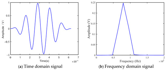 To improve frequency selectivity and avoid multimode interference, the excitation signal was designed as a five-cycle sine wave modulated with a Hanning window, with a center frequency of 80 kHz, as shown in Figure 14. This configuration provides a narrowband response with minimal spectral leakage and effectively concentrates energy within the typical notch frequency range of the L(0,1) mode.