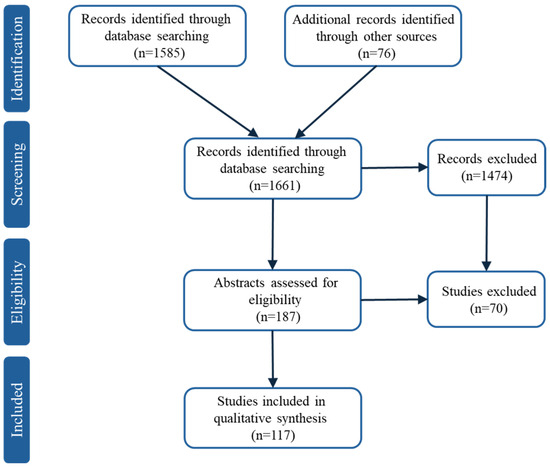 A total of 1661 records were initially identified. After removing duplicates and screening titles and abstracts, 187 articles were selected for full-text assessment. Ultimately, 117 studies met the inclusion criteria and were retained for qualitative synthesis. The selection process is illustrated in Figure 1.