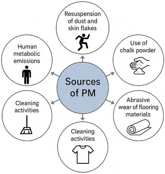 In indoor sports environments, PM arises from a wide range of primary and secondary sources, both internal and external. Figure 2 shows the key indoor PM sources, which originate from several key sources. Intense foot traffic, jumping, and the use of equipment can resuspend settled dust and skin flakes [33]. In addition, the use of chalk powder (magnesium carbonate) in activities (e.g., gymnastics, climbing, and weightlifting) contributes significantly to airborne particles [34]. In addition, abrasive wear of flooring materials, especially rubber or PVC sports mats and synthetic turf, also releases fine particulates into the air. Also, textile fiber shedding from sportswear, upholstery, and wall padding further adds to the indoor PM load. Additionally, cleaning activities, particularly dry sweeping or vacuuming without high-efficiency particulate air (HEPA) filters, can lead to the resuspension of settled particles [34]. Moreover, human metabolic emissions may act as precursors for secondary particle formation through chemical reactions with indoor oxidants, thereby exacerbating indoor air pollution [33,34]. Several studies have identified secondary particle formation indoors, resulting from the interaction of ozone (O3) with VOCs emitted from building materials or human skin lipids. Such complex chemical interactions can contribute to ultrafine particle concentrations even in the absence of obvious dust-generating activities [35,36].
