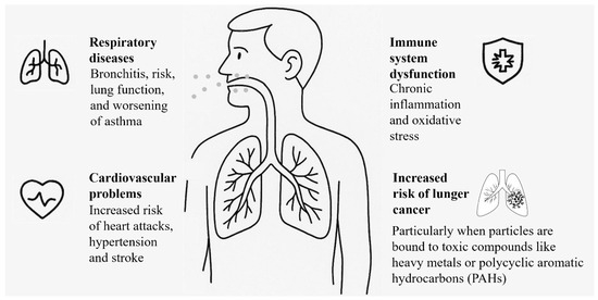The health impacts of PM are closely associated with particle size, composition, and exposure duration [46]. Larger particles (PM10) typically deposit in the upper respiratory tract, where they may cause irritation, coughing, and exacerbate symptoms in individuals with asthma or allergic rhinitis [46]. However, PM2.5, PM1, and UFPs can penetrate deep into the bronchioles and alveolar regions of the lungs, leading to more severe and systemic health problems. Prolonged or repeated exposure to fine and ultrafine particles (UFPs) has been linked to a range of adverse health effects, as shown in Figure 3 [46]. UFPs, in particular, pose a unique threat due to their ability to translocate across the alveolar-capillary barrier, potentially entering the bloodstream and reaching distant organs such as the heart and brain. This systemic distribution has been associated with neuroinflammatory responses, cognitive impairment, and developmental effects in children [47].