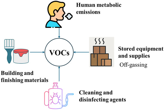 The indoor environment of sports facilities typically contains a wide variety of VOC sources, many of which are either continuously emitting or periodically introduced during cleaning, maintenance, or occupant activities [11]. Figure 4 shows the key sources of indoor VOCs, which include building and finishing materials (e.g., paints, adhesives, synthetic flooring, and particleboard furniture), cleaning and disinfecting products containing alcohols and aldehydes, personal care products (e.g., deodorants and perfumes used by occupants), metabolic emissions from users (e.g., isoprene and acetone), which react with ozone to form secondary pollutants, and equipment or supplies stored in poorly ventilated areas, contributing to VOC buildup [11,51,52]. These compounds often accumulate indoors due to limited dilution with outdoor air and insufficient removal by heating ventilating and air-conditioning (HVAC) systems, especially in high-use areas with intermittent ventilation or inadequate air exchange rates.
