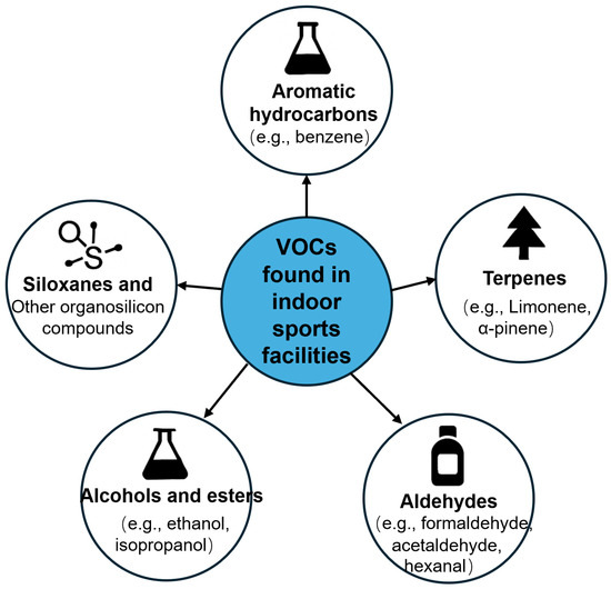 VOCs found in indoor sports facilities span multiple chemical families, including aromatic hydrocarbons, terpenes, aldehydes, alcohols and esters, and siloxanes, as illustrated in Figure 5 [11,53]. Measured concentrations of VOCs in sports facilities can vary significantly depending on building type, material age, cleaning frequency, and ventilation efficiency. Studies have reported TVOC (Total VOC) concentrations in gyms and sports halls ranging from a few µg/m3 to over 500 µg/m3, occasionally exceeding recommended indoor air thresholds during or shortly after cleaning activities or high-occupancy events [11,54].