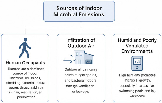 Microbial contamination in indoor air primarily originates from three major sources, including human occupants, infiltration of outdoor air and humid and poorly ventilated environments [69,70,71]. Figure 7 shows the sources of indoor microbial emissions. To be specified, human occupants are a major source of indoor microbial emissions, especially during physical activity, which increases the shedding of skin cells, hair, and respiratory bioaerosols [71]. Outdoor air can also introduce microbial particles like pollen and fungal spores through ventilation or leakage, particularly in urban or vegetated areas [70]. Inadequate filtration or airflow can lead to their accumulation indoors. Moreover, high humidity in spaces, such as locker rooms and swimming pools, supports microbial growth, while moisture from leaks or condensation creates favorable conditions for colonization [69]. Poorly maintained HVAC systems may further contribute to microbial buildup and distribution [69].