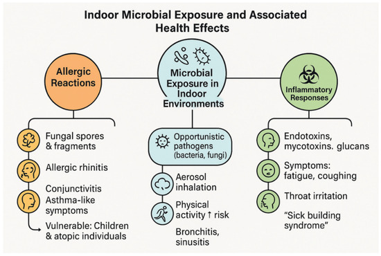 Although not all microbes pose health risks, certain species have been linked to a range of adverse effects, particularly in sensitive populations [75]. Figure 8 shows an overview of possible health impacts caused by microbes. Exposure to indoor fungal spores and fragments can lead to allergic responses (e.g., rhinitis, conjunctivitis, dermatitis, and asthma-like symptoms), especially among children and individuals with atopic predispositions [76]. The upward arrow (↑) indicates an increased risk associated with physical activity under microbial exposure conditions. Opportunistic bacteria and fungi may cause respiratory infections such as bronchitis and sinusitis when contaminated aerosols are inhaled, notably during periods of intense physical activity [67]. Furthermore, microbial components (e.g., endotoxins, mycotoxins, and glucans) can induce non-allergic inflammatory responses, resulting in fatigue, coughing, throat irritation, or symptoms resembling sick building syndrome [77].