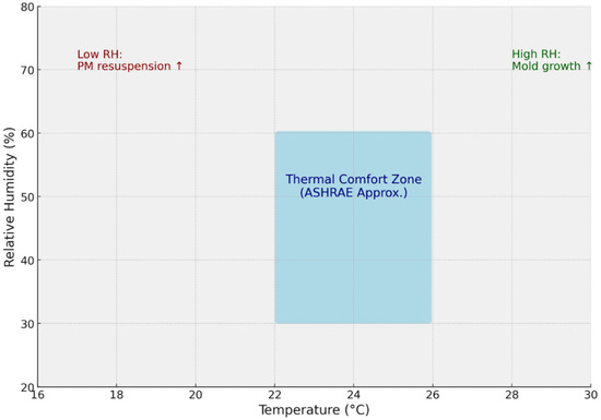 Relative humidity (RH) also influences several critical processes, as shown in Figure 9 [83]. The upward arrow (↑) indicates an increase in the associated risk or phenomenon (e.g., enhanced PM resuspension at low RH, increased mold growth at high RH).