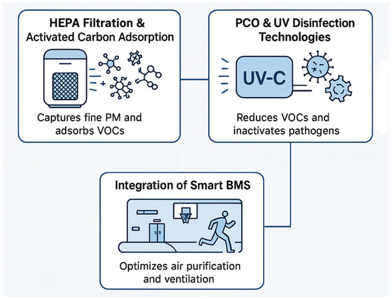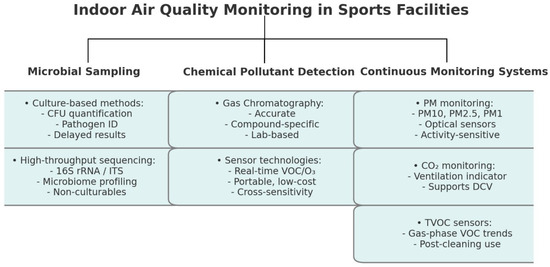 To effectively manage IAQ in sports facilities, a comprehensive monitoring approach should integrate microbial, chemical, and real-time sensing methods (see Figure 10). Microbial sampling combines culture-based techniques for quantifying viable organisms with high-throughput sequencing to capture broader microbial diversity [78]. Chemical pollutants (e.g., VOCs, aldehydes, and ozone) can be detected through high-precision methods (e.g., gas chromatography or real-time sensor technologies) [90]. Continuous monitoring systems, including PM, CO2, and TVOC sensors, help track rapid fluctuations caused by occupant activity and environmental changes, supporting responsive ventilation and exposure control across different facility zones [89]. Data from continuous systems can be integrated into building management systems (BMS) or mobile platforms to provide alerts, analytics, and real-time control signals, enhancing responsiveness and occupant safety [91].