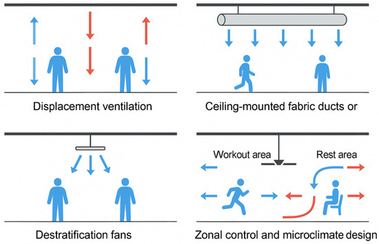 In addition, air velocity is another crucial factor in both thermal comfort and pollutant transport [86]. In high-ceiling spaces (e.g., gymnasiums or sports halls), air stratification is common, and poor air distribution can lead to stagnant zones with localized buildup of CO2, VOCs, and PM [83]. Controlled air movement is essential for diluting and removing pollutants from the breathing zone, preventing hot/cold spots that reduce user comfort, and enhancing sweat evaporation and heat dissipation during physical exertion. However, excessive air velocity (>0.3 m/s in occupied zones) may result in draft discomfort, particularly during low-intensity activities or recovery phases. Therefore, balancing airflow distribution through ceiling-mounted diffusers, displacement ventilation, or personalized airflow strategies is key to maintaining optimal conditions [83].