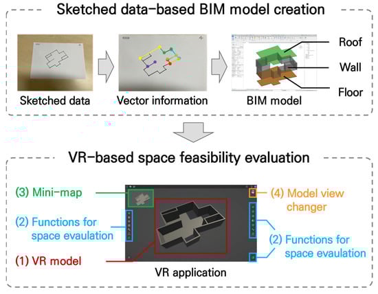 The operational mechanism of the Space FeAsibility aSsessment (SFAS) system consists of two main stages: (1) the automatic generation of a Building Information Modeling (BIM) model based on user-provided sketch information, and (2) the integration of the BIM model with a virtual reality (VR) environment. Figure 1 illustrates the overall workflow of the SFAS system.