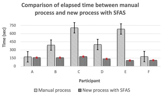 The average time required for the manual process was 423 s, while the system-supported process required an average of 143 s, which is approximately 0.34 times the duration of the manual method. This clearly demonstrates that the system-supported process was significantly faster.