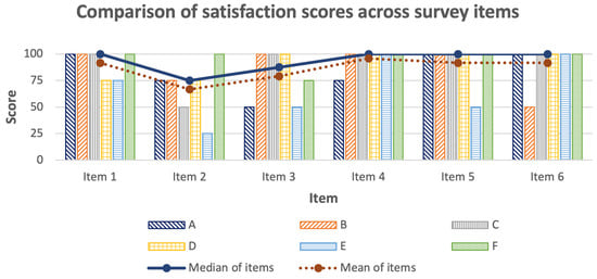 Table 7 summarizes responses to Items 1 through 6, converted to a 0–100 scale (0 = very dissatisfied, 100 = very satisfied). Figure 5 presents the distribution of individual participant responses for Items 1 through 6 as bar graphs, with the corresponding median (solid line) and mean (dashed line) overlaid, highlighting central tendency and item-level variability. Mean satisfaction scores across items ranged from 66.67 to 95.83, covering a range from neutral to very satisfied. Median satisfaction scores ranged from 75 to 100, indicating that participants were generally somewhat to very satisfied. These results suggest that participants generally had a favorable perception of the SFAS system’s spatial evaluation capabilities.