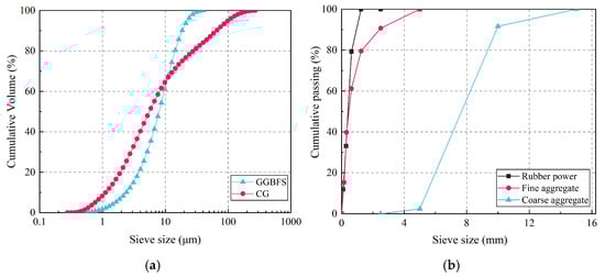 Fine aggregates consisted of rubber powder (RP) from waste tires and river sand, while crushed granite served as the coarse aggregate. The particle sizes of these aggregates are illustrated in Figure 1b, determined via sieve analysis following ASTM D5644 standards [58]. River sand had a maximum particle size of approximately 5 mm with continuous grading; crushed granite ranged from 5 to 15 mm; and RP was 20-mesh. Their densities were 2.64 g/cm3 (river sand), 2.66 g/cm3 (crushed granite), and 0.76 g/cm3 (RP), as listed in Table 2. Ordinary straight steel fibers (SFs) had a length of 13 mm, and the diameter, tensile strength, and elastic modulus were 0.2 mm, 2800 MPa, and 200 GPa, respectively. Laboratory water was used to control the liquid-to-solid ratio, and retarder (BaCl2) was added to prevent rapid setting of SFRRGC. All materials were sourced from both laboratory stocks and commercial suppliers.