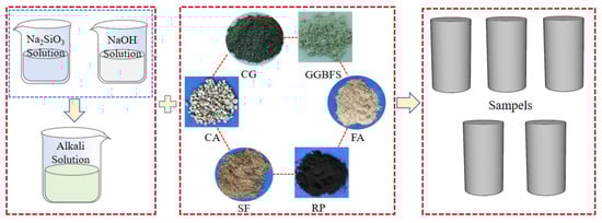 Figure 2 shows the mixing procedures: (1) Prepare the alkali activator by blending sodium hydroxide and sodium silicate solutions for 5 min, then cool to room temperature. (2) Dry-mix CG, GGBFS, SF, RP, sand, and crushed granite in a planetary mixer for 180 s to ensure uniformity. (3) Add the alkaline activator and extra water, mixing for 3 min. Workability of fresh SFRRGC was assessed via slump test before casting into 100 × 200 mm cylindrical molds. Specimens were compacted on a vibrating table, covered with polyethylene film to minimize moisture loss, and cured at approximately 25 °C. They were demolded after 24 h and stored in a 20 ± 2 °C curing room for 28 days; the humidity was ≥95%.