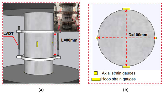 Compressive strength test setup: (a) the setup; (b) the strain gauges.