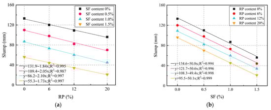 The reference mixture (SF0R0) exhibited a maximum slump value of 133.1 mm. As shown in Figure 4a,b, slump values decreased with increasing SF or RP content, with SFs having a more pronounced effect. Increasing SF content from 0% to 1.5% (SF1.5R0) reduced slump by 57.93%, while a 0% to 20% RP addition decreased slump by 27.87%. Specifically, slump values dropped to 110 mm, 87 mm, and 56 mm at 0.5%, 1.0%, and 1.5% SF, respectively. For RP, slump reductions of 9.69%, 18.11%, and 27.87% were observed at 6%, 12%, and 20% replacement levels. The combined addition of SFs and RP caused a notable slump decrease: SF1.5R20 showed a slump of 21 mm, an 84.22% reduction compared to SF0R0. This workability decline is attributed to increased shear resistance from fibers [60,61] and higher water absorption by RP, which reduces effective water content in the mixtures [62].