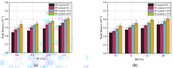 Peak strains of the specimens were determined following the method described in previous research [70] and are presented in Figure 9. Increasing RP content from 0% to 20% led to higher peak strains, with a similar positive correlation observed for SF content. In the series without SFs (SF0Ry), the maximum peak strain reached 3.70 at 20% RP (SF0R20, Figure 9a). For the RP-free series (SFxR0, Figure 9b), peak strains increased with SF content (0–1.5%), with SF1.5R0 exhibiting the highest value (3.62)—12.42% higher than SF0R0. These results indicate that both RP and SFs independently promote peak strain in SFRRGC.