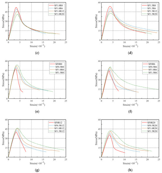 Stress–strain curves: (a) SF0Ry; (b) SF0.5Ry; (c) SF1.0Ry; (d) SF1.5Ry; (e) SFxR0; (f) SFxR6; (g) SFxR12; and (h) SFxR20.