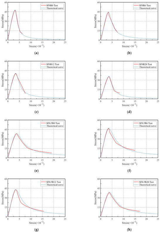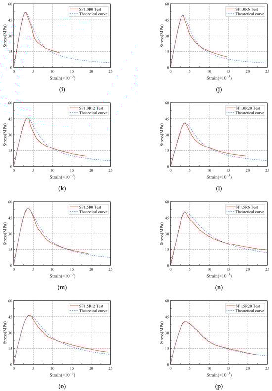 A comparative analysis of the proposed constitutive model and the experimental stress–strain curves are illustrated in Figure 12. From this analysis, it is evident that the theoretical curves align well with the experimental results, suggesting that the proposed constitutive model effectively predicts the stress–strain behavior of SFRRGC. This alignment (or the observed complexity in behavior) arises from the interplay between SFs and RP in regulating the compressive properties of geopolymer concrete. In this research, all Ri values (corresponding to SF and RP combinations) were treated as variables and fitted concurrently. While extensive experimental investigations are still necessary to thoroughly explore the failure mechanisms and optimize the constitutive model of SFRRGC, the findings of this study indicate that Equations (4) and (5) can reliably predict the stress–strain characteristics of the composite. Furthermore, the proposed model is capable of forecasting the stress–strain curves of SFRRGC with different SF and RP mixture proportions.