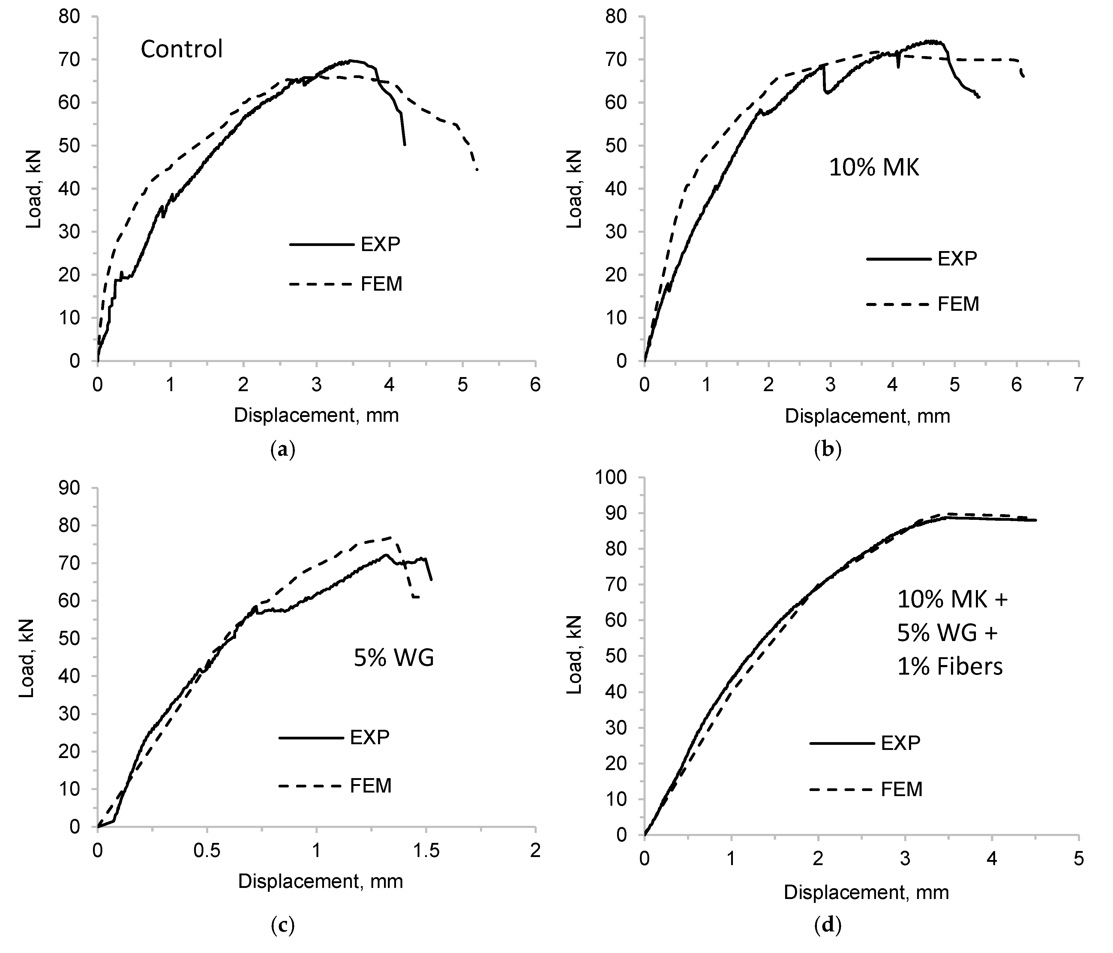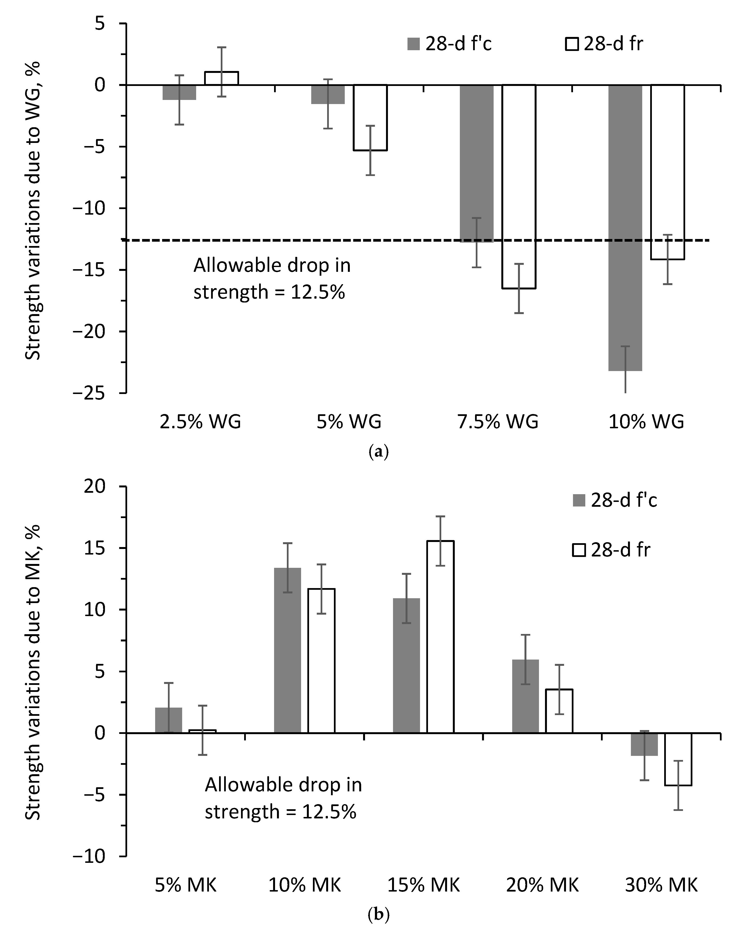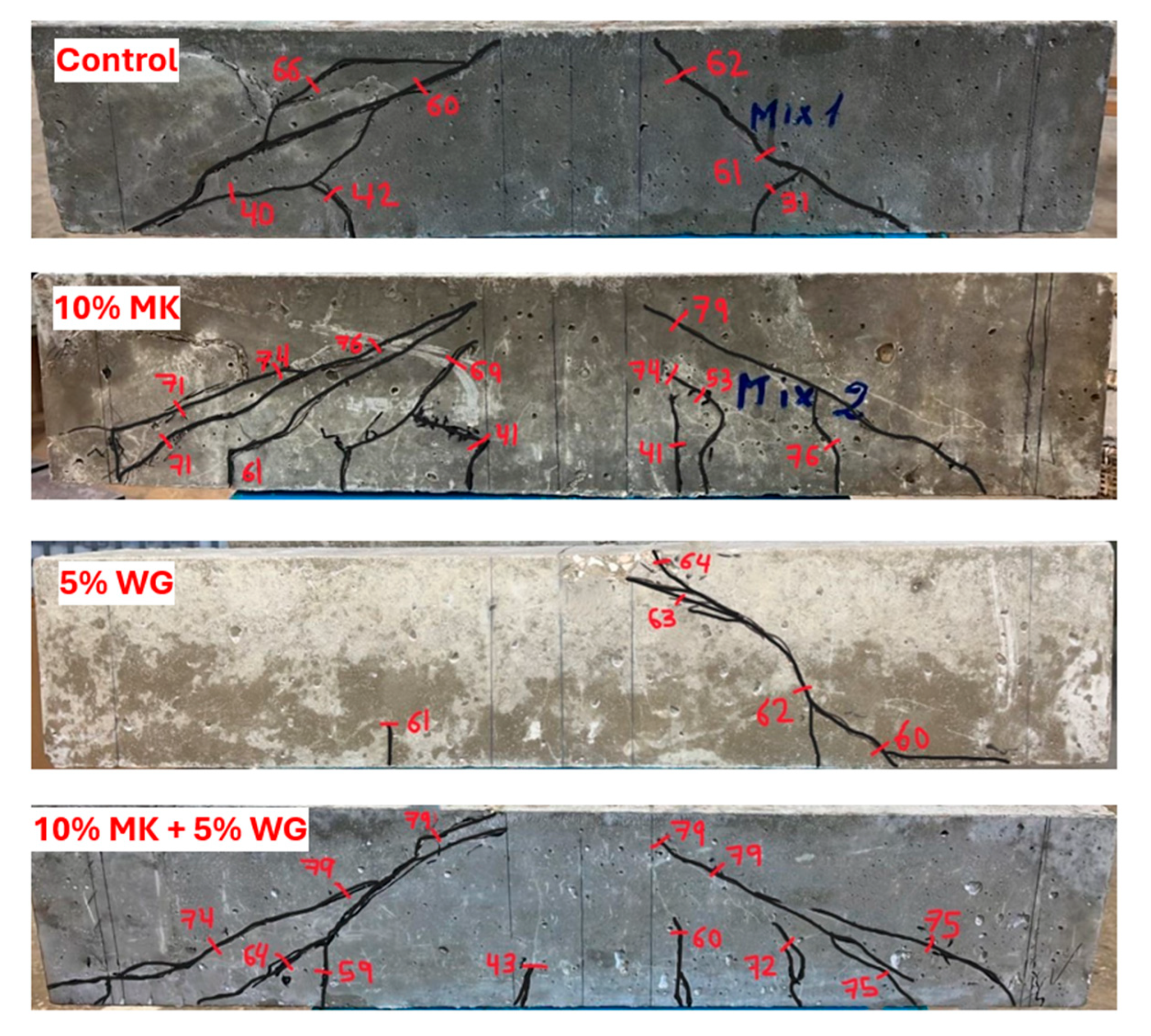 - At the concrete scale, MK enhanced compressive strength and reduced sorptivity, while WG improved workability but decreased ductility when used alone. The combined MK–WG system achieved a 13% increase in shear strength relative to the control mix, demonstrating clear benefits in structural performance.