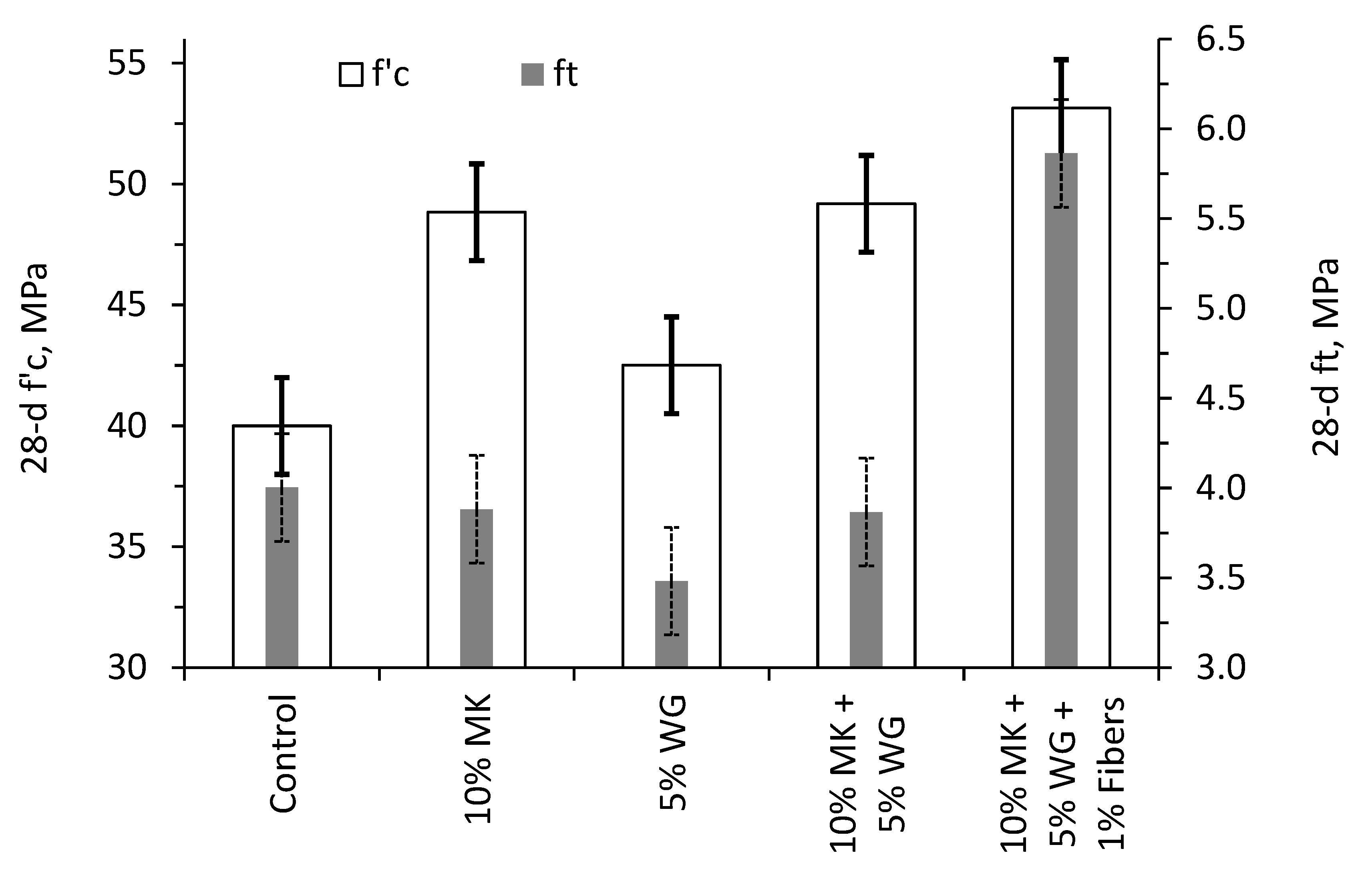 Property | Control | 10% MK | 5% WG | 10% MK + 5% WG | 10% MK + 5% WG + 1% Fibers |