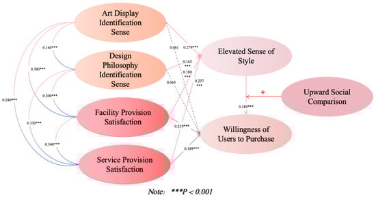 Art display identification sense, design philosophy identification sense, facility provision satisfaction, service provision satisfaction, willingness of users to purchase, and elevated sense of style, the latent variable factor path model is shown in Figure 2, and its model fitting results and hypothesis validation results are shown in Figure 2.