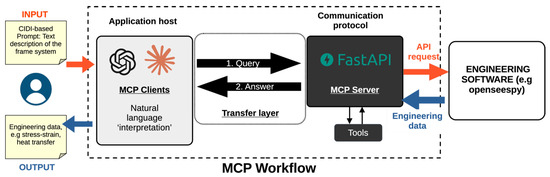 Unlike conventional interpreter–agent frameworks, such as those built with LangChain, which rely on predefined tool chains and modular orchestration components (e.g., LangGraph for workflow modelling, LangServe for scalable API deployment, and LangSmith for monitoring), MCP natively supports autonomous tool discovery, context-driven selection, and execution without requiring manual API wiring or platform-specific plugin management [15,16]. While LangChain provides a mature ecosystem for orchestrating multi-step workflows, Retrieval-Augmented Generation, and secure API integrations, the MCP introduces a dynamic and standardised interface that extends beyond these capabilities. MCP enables the communication of an LLM with external resources, prompt templates, and specialised tools, thereby contextualising tasks with domains not originally present in the LLM’s training data. This architecture not only permits the implementation of agents or AI-based applications over MCP but also ensures interoperability, computational fidelity, and traceability within real-time engineering workflows.