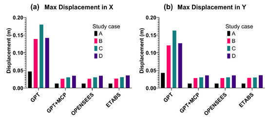 Maximum inter-storey displacement in the X (a) and Y (b) directions for each case study (A–D) and computational method. The GPT+MCP pipeline corresponds to ChatGPT-assisted modelling using the MCP, while standalone GPT results are generated without model feedback. ETABS and OpenSees serve as reference solutions.