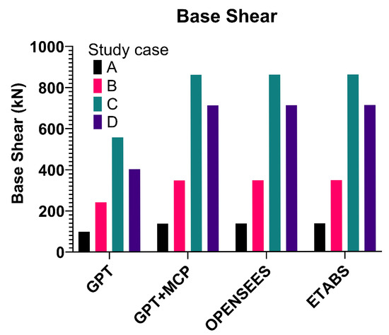 The integration of standalone GPT with GPT+MCP exhibited remarkable consistency with the outputs of both OpenSees and ETABS. The base shear values obtained from GPT+MCP were nearly identical to those from OpenSees across all cases, and exhibited minimal deviations from ETABS. For instance, in Case D, GPT+MCP, OpenSees, and ETABS reported 712.342 kN, 712.342 kN, and 712.460 kN, respectively.