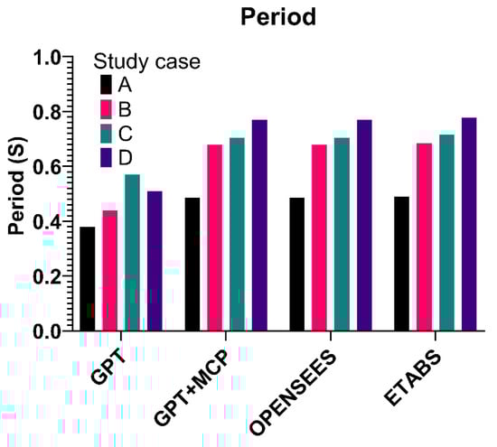 The GPT-only model consistently underpredicted the fundamental period, reporting values of 0.38 s, 0.44 s, 0.57 s, and 0.51 s for Cases A, B, C, and D, respectively (Figure 4). In contrast, both the GPT+MCP and the pure OpenSees analyses yielded identical period estimates—0.485 s, 0.679 s, 0.705 s, and 0.769 s—which closely approximated the ETABS results of 0.489 s, 0.684 s, 0.715 s, and 0.777 s.