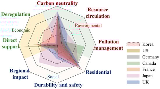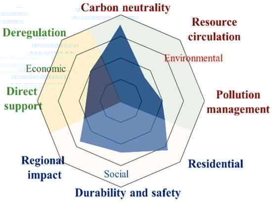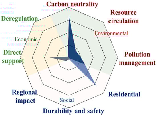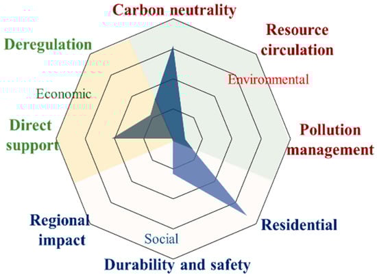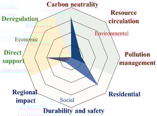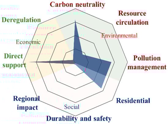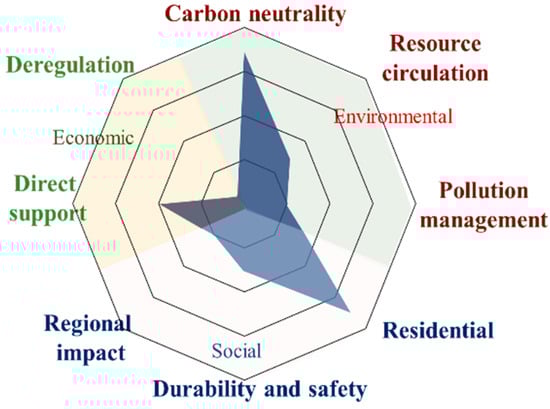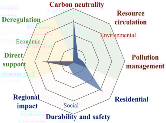 - Cross-national policy comparison:The comparative analysis revealed that most countries, except Japan, placed the greatest emphasis on carbon neutrality (environmental), habitability (social), and direct support (economic). However, significant gaps remain, including limited attention to resource circulation, pollution management, and deregulation.