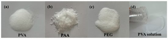 The morphology of polymer powder and solution. (a) PVA powder; (b) PAA powder; (c) PEG powder; (d) PVA solution.