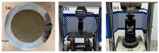 The preparation process of the polymer-modified mortar was as follows: First, the designated amount of polymer was added to the mixing water and stirred using a magnetic stirrer for 3 min to ensure complete dissolution, forming a homogeneous polymer solution (Figure 1d). This solution was then thoroughly mixed with cement and standard sand using an automatic mortar mixer to produce the polymer-modified mortar slurry. The workability of the fresh mortar was evaluated according to the GB/T 2419-2005 standard []. The slurry was subsequently cast into 40 mm × 40 mm × 160 mm molds, compacted via vibration, surface-leveled, and cured under standard curing conditions (relative humidity 95 ± 5%, temperature of 23 ± 2 °C) until the designated testing age. Following curing, the compressive and flexural strengths were measured in accordance with the GB/T 17671-2021 standard []. The samples for the fluidity, flexural, and compressive tests are shown in Figure 2a–c, respectively.
