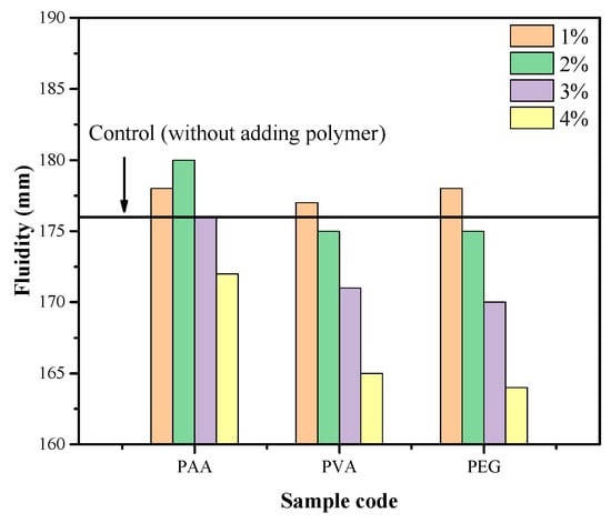 After the incorporation of polymers into the mortar, their inherent moisture-adsorption characteristics altered the number of water molecules adsorbed on the surface of the cement particles, thereby influencing the fluidity of the fresh slurry. As shown in Figure 3, the control group (without polymer) exhibited a flow diameter of 176 mm. With the addition of 1% polymer, a slight increase in fluidity was observed. This enhancement is primarily attributed to the formation of an adsorbed water film by the polymers, which provides a lubricating effect, promotes homogeneous dispersion of particles, and improves the overall flowability of the slurry []. However, as the polymer dosage increases beyond 1%, a gradual decline in fluidity is observed. At a dosage of 4%, the flow diameters of mortars modified with PEG, PVA, and PAA decreased to 164 mm, 165 mm, and 174 mm, respectively. Among the three, PEG exhibits the most pronounced reduction in workability. This may be attributed to the higher oxygen content in the PEG molecular structure, which enhances its water-binding capacity and reduces the availability of free water within the mix. In contrast, PVA and PAA contain fewer oxygen-containing functional groups, resulting in a less significant impact on fluidity. These findings indicate that higher polymer dosages do not necessarily lead to improved performance. Since fluidity directly affects the workability and application quality of mortar, it is essential to conduct a systematic evaluation to determine the optimal dosage range for each polymer type to balance fluidity and mechanical or durability enhancements effectively.