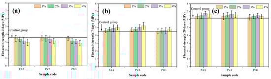 The flexural strength results are presented in Figure 4. As shown in Figure 4a, the 3-day flexural strength of the control group was 3.6 MPa. Upon the incorporation of polymers, the early flexural strength of the polymer-modified mortars exhibited a declining trend. This reduction is primarily attributed to the formation of a polymer film on the surface of the cement particles, which impedes the ingress of water molecules and subsequently inhibits the early hydration process, thereby limiting early-age strength development. Moreover, the negative impact becomes more pronounced with increasing polymer dosage. At a 4% dosage, the flexural strengths of mortars modified with PAA, PVA, and PEG decreased to 3.0 MPa, 2.9 MPa, and 3.2 MPa, respectively. Among them, PVA exhibited the most significant strength reduction at early age. This can be attributed to the strong interfacial adhesion between PVA molecules and the cement matrix, which restricts moisture transport into the particles and intensifies the inhibition of early hydration reactions [].