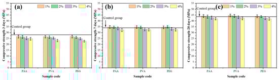 Compared to flexural strength, which primarily reflects the ductility of the matrix and interparticle interactions, compressive strength is more strongly influenced by the matrix porosity and the degree of cement hydration, thereby serving as an indicator of matrix compactness. The compressive strength results at different curing ages (3, 7, and 28 days) are presented in Figure 5. As shown in Figure 5a, the 3-day compressive strength of the control group was 27.1 MPa. The incorporation of polymers significantly reduced the early compressive strength, with the extent of strength loss increasing proportionally to polymer content. This observation, together with the fluidity test results (Figure 3), suggests that polymer molecules competitively adsorb water from the surface of the cement particles, impeding their interaction with water and thereby inhibiting the early hydration reaction. This finding aligns with the early-age strength reduction observed in flexural strength measurements, confirming the inhibitory effect of polymers on cement hydration at early stages. At a 4% polymer dosage, the compressive strengths of mortars modified with PAA, PVA, and PEG decreased to 24.7 MPa, 23.2 MPa, and 22.7 MPa, respectively. Among these, PEG caused the most pronounced strength reduction, which is attributed to its stronger affinity for water molecules. This higher water adsorption capacity substantially diminishes the effective hydration degree of the matrix, consistent with the notable negative impact of PEG on slurry fluidity.