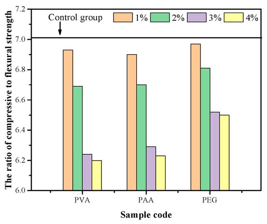 The ratio of compressive strength to flexural strength serves as an effective indicator of material toughness, with a lower ratio corresponding to improved toughness. The compressive-to-flexural strength ratios of all samples at 28 days are presented in Figure 6. The control group exhibited a ratio of 7.065. Notably, the polymer-modified mortars demonstrated a consistent decrease in this ratio with increasing polymer content. At a 4% polymer dosage, the compressive-to-flexural strength ratios for mortars modified with PAA, PVA, and PEG decreased to 6.23, 6.20, and 6.50, respectively. Among these, the PVA-modified mortar exhibited the lowest ratio, further corroborating the superior toughening effect of PVA through its effective “riveting” mechanism within the cement matrix.