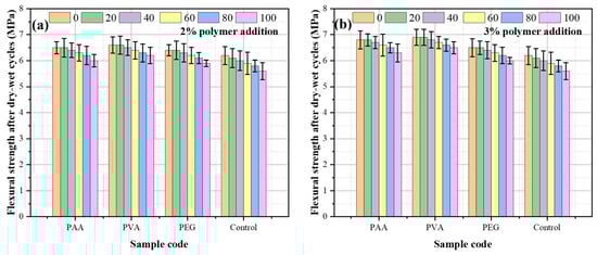 The flexural strength after dry–wet cycles: (a) 2% polymer addition; (b) 3% polymer addition.