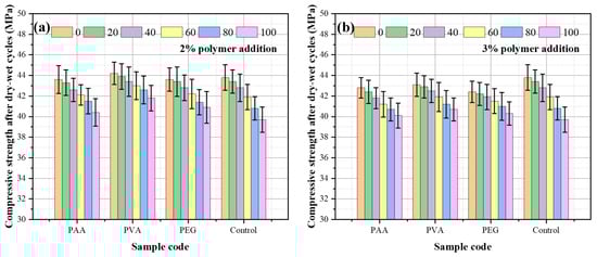 The compressive strength after dry–wet cycles: (a) 2% polymer addition; (b) 3% polymer addition.
